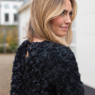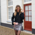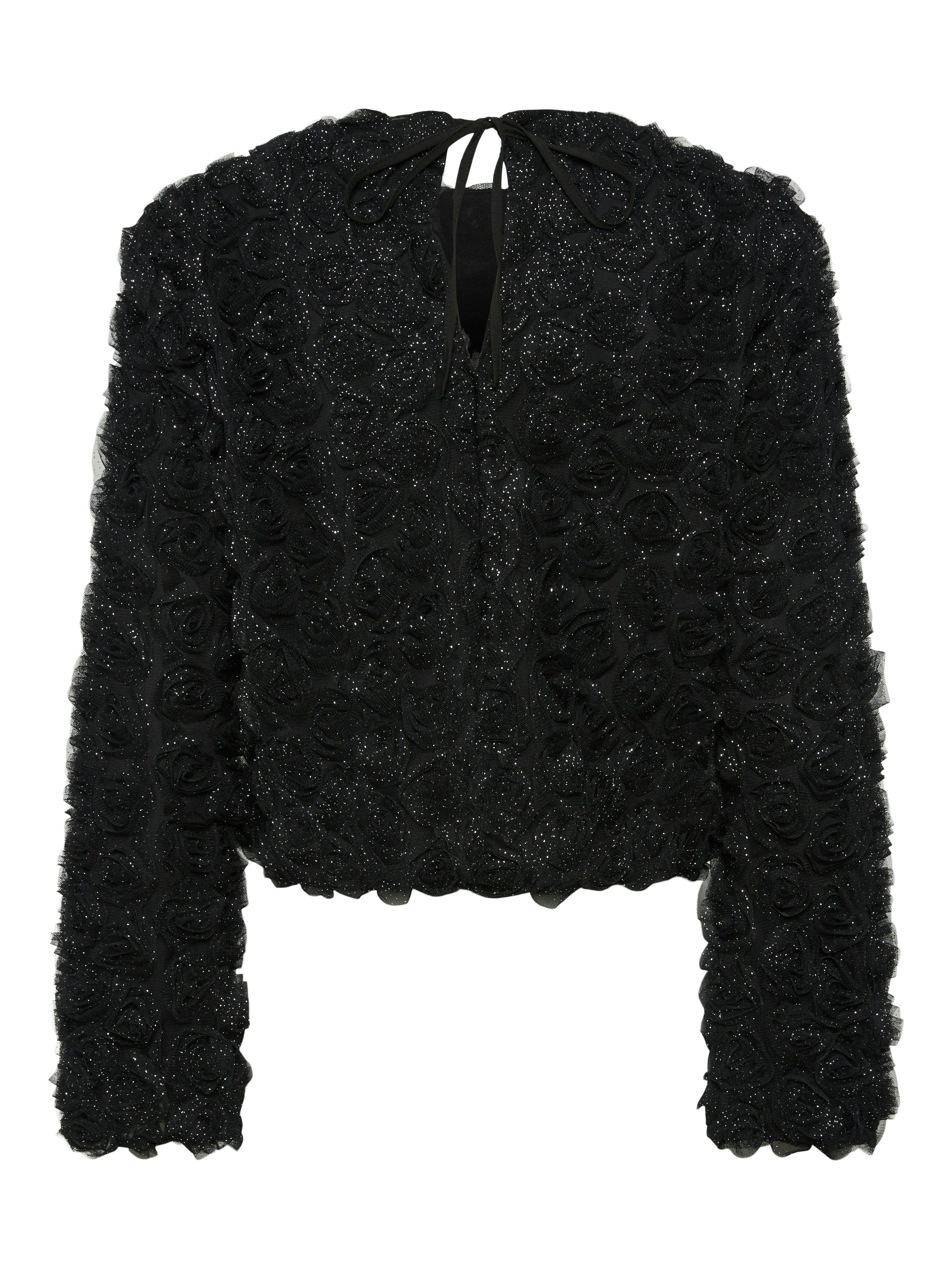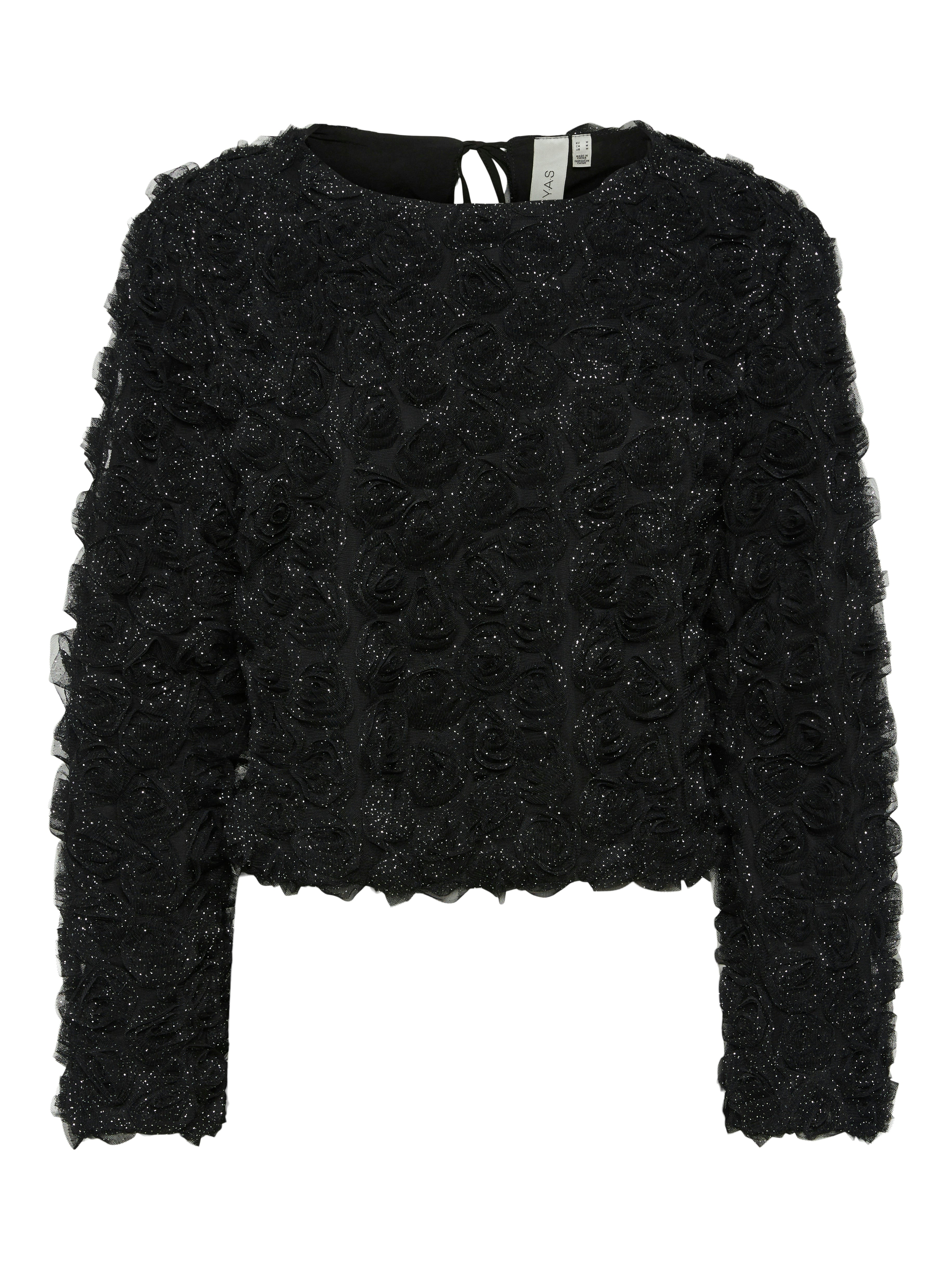 Mooie zwarte blouse met glitters van YAS. De top heeft een mooi motiefje met kleine roosjes en is te strikken aan de achterkant. Combineer met een leuke pantalon.