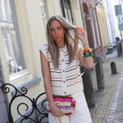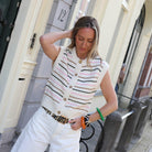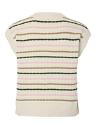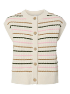 Deze prachtige gebreide gilet is een echte toevoeging aan je voorjaarsgarderobe. Het mouwloze vestje heeft een verfijnd streeppatroon in zachte tinten zoals roze, olijfgroen en camel op een ecru basis. De top is voorzien van een ronde hals, een klassieke knoopsluiting met houtlook knopen en een subtiele textuur in het breisel die zorgt voor een luxe uitstraling.