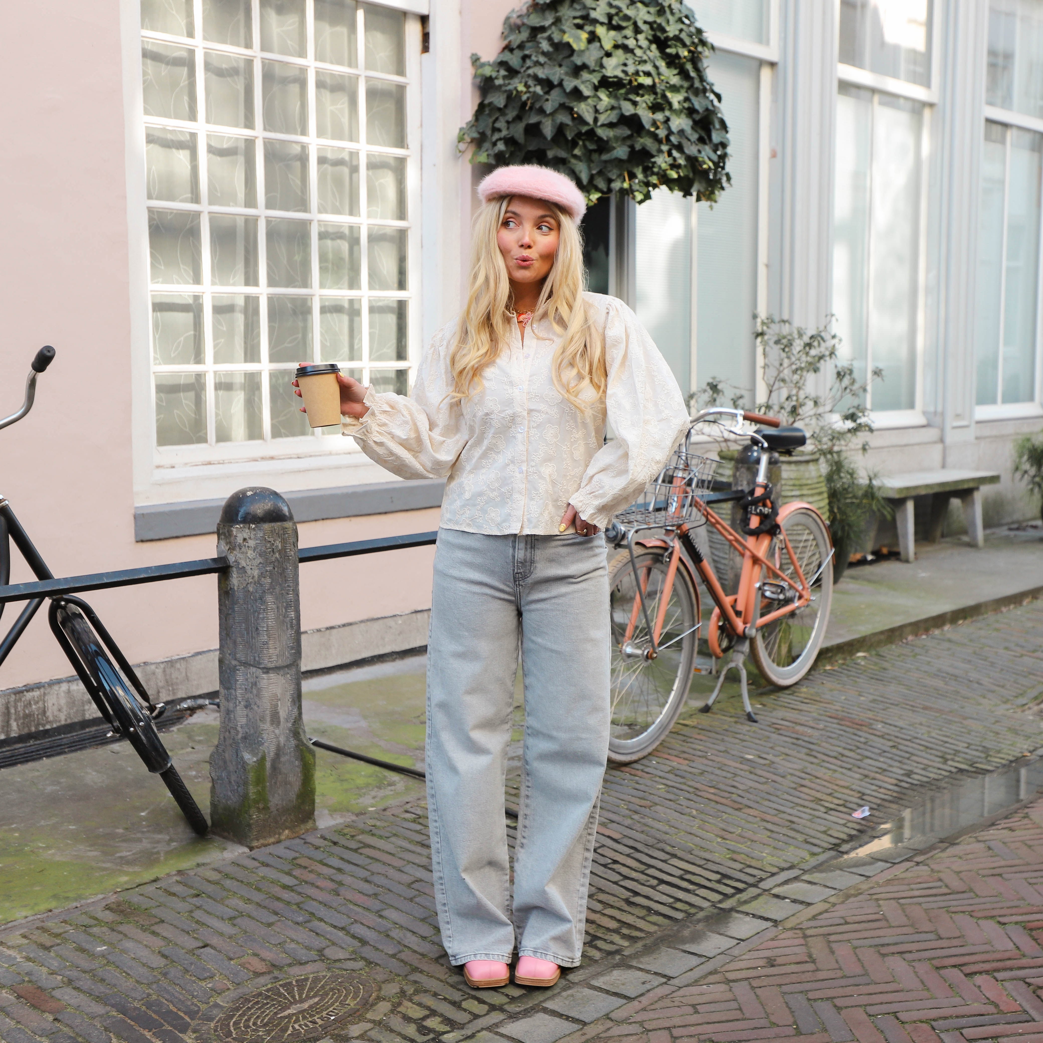 Blouse Novia is een blouse van semi-transparante stof in ecru met prachtige geborduurde bloemen. De blouse heeft een licht getailleerde pasvorm, pofmouwen met een klein rufflerandje, een kraagje en sluit met een knoopsluiting aan de voorzijde. Perfect voor een elegante en vrouwelijke uitstraling!